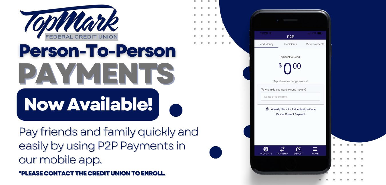 P2P payments are a digital cash alternative that makes sending and receiving money as easy as emailing and texting.  Send money electronically to anyone, anytime at any financial institution using our mobile app.